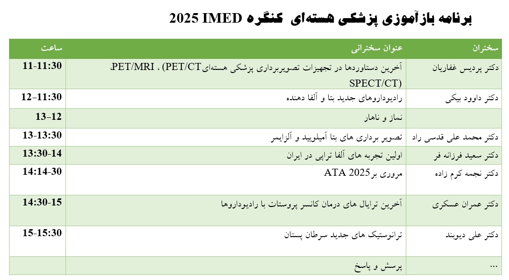 عضو هیات مدیره انجمن علمی پزشکی هستهای ایران و دبیر علمی همایش تازههای پزشکی هستهای گفت: همایش یک روزه تازههای پزشکی هستهای روز پنجشنبه ۱۷ مهر ماه از ساعت ۱۱ تا ۱۶، همزمان با نخستین روز برگزاری نمایشگاه ایران مد ۲۰۲۵ در مجموعه نمایشگاهی شهرآفتاب برگزار میشود.