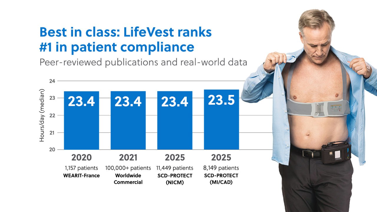 دستگاه لایف وست درمان بسیار موثر و ایمنی را برای بیماران در خطر مرگ ناگهانی قلبی ارائه میدهد و بالاترین میزان پایبندی به درمان WCD را توسط بیماران دارد.
